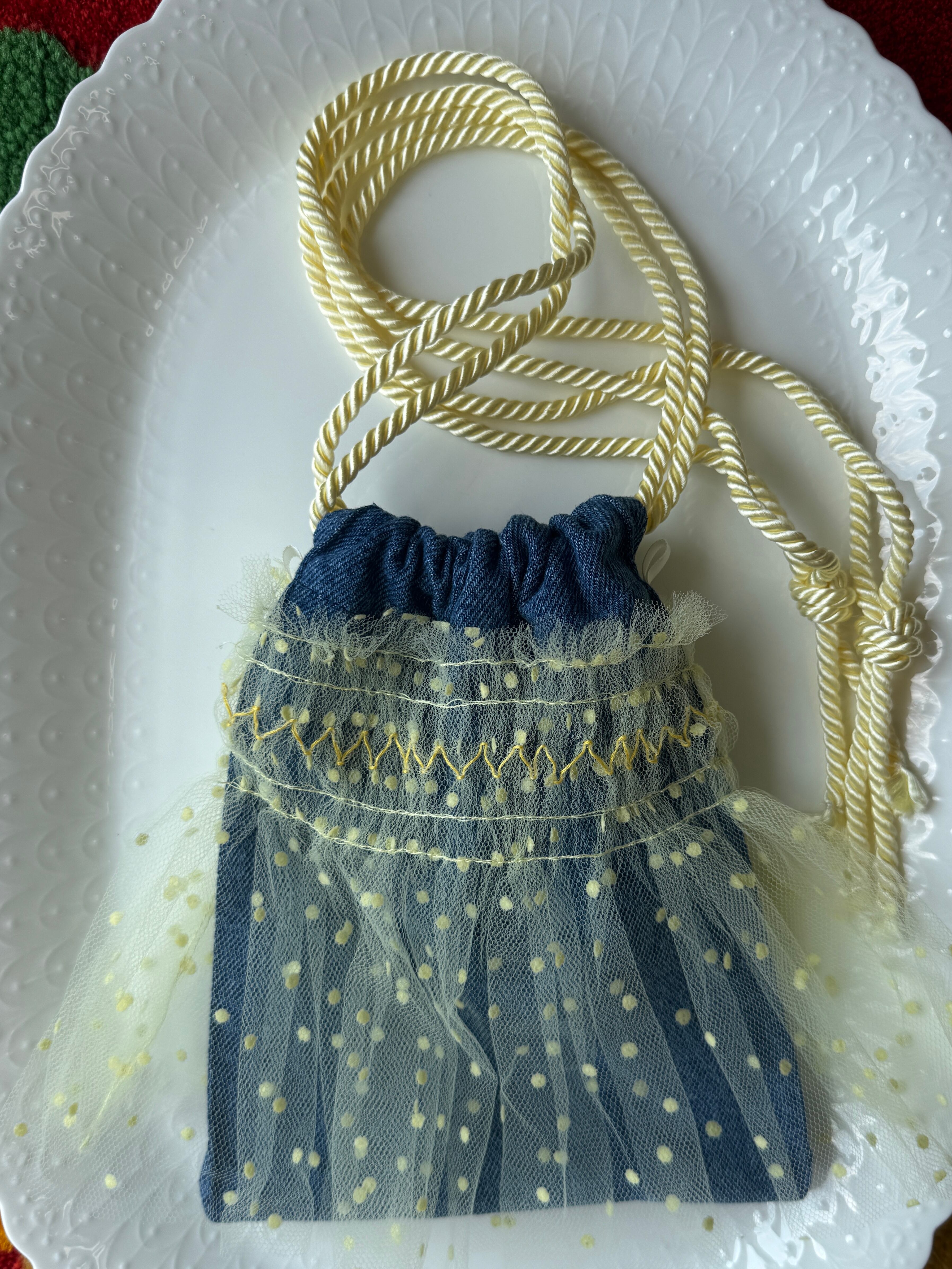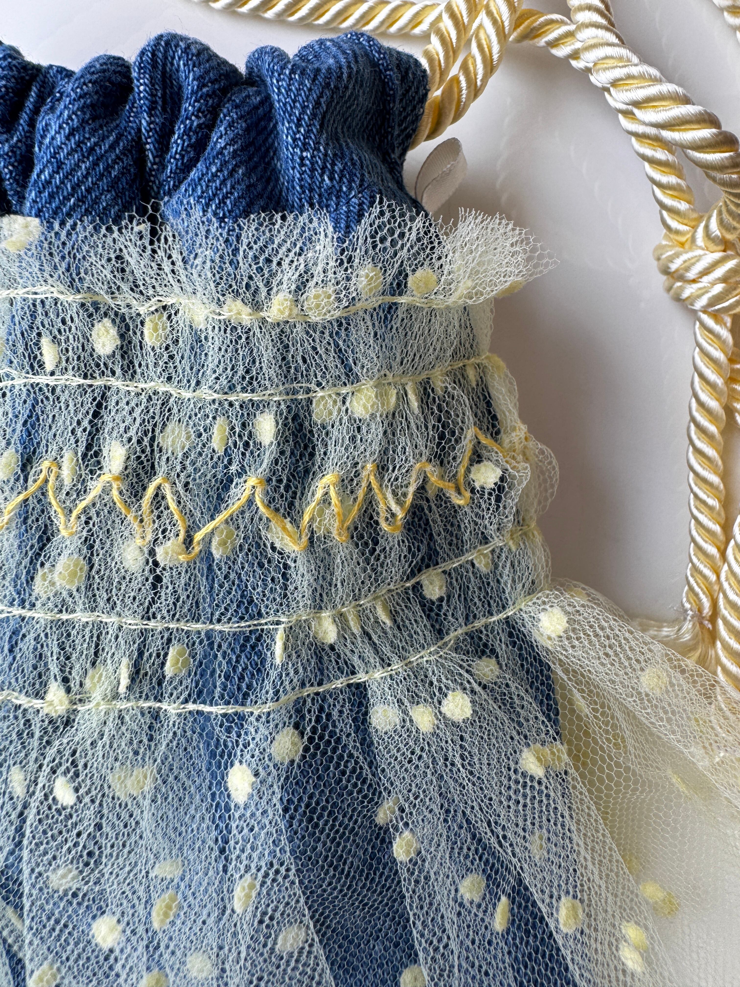ドットチュールの生地で仕立てたドレスバッグ。