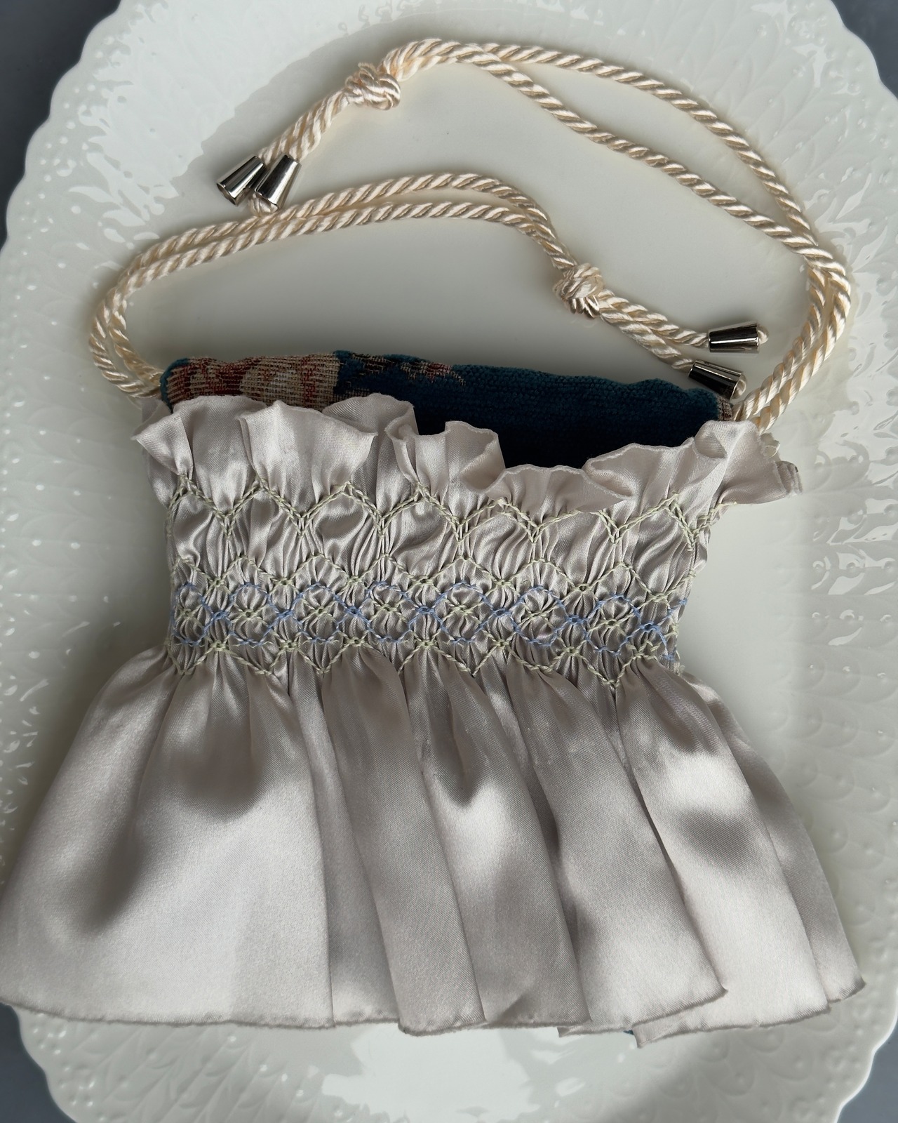 サテン生地とゴブラン生地で仕立てたドレスバック。